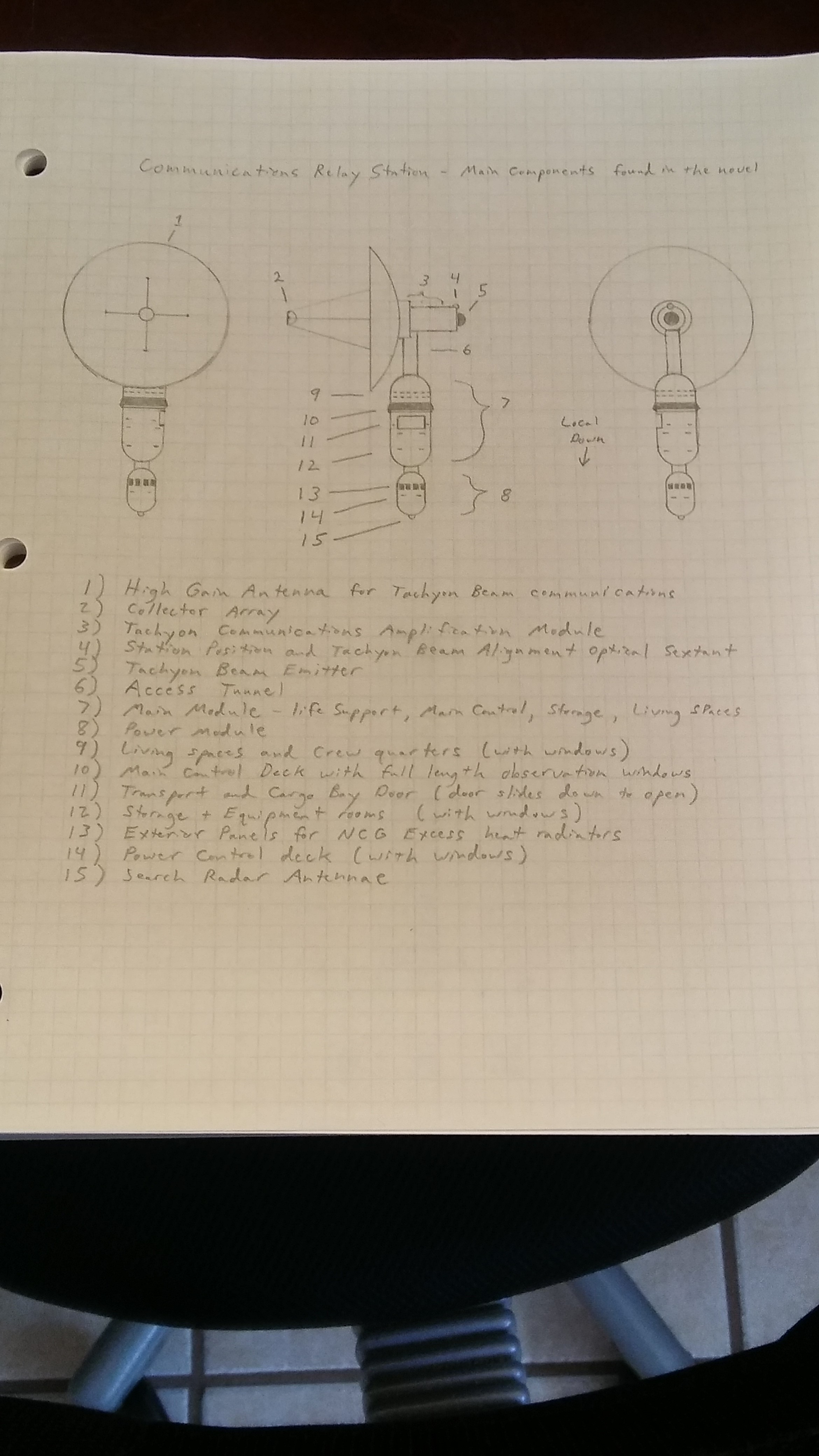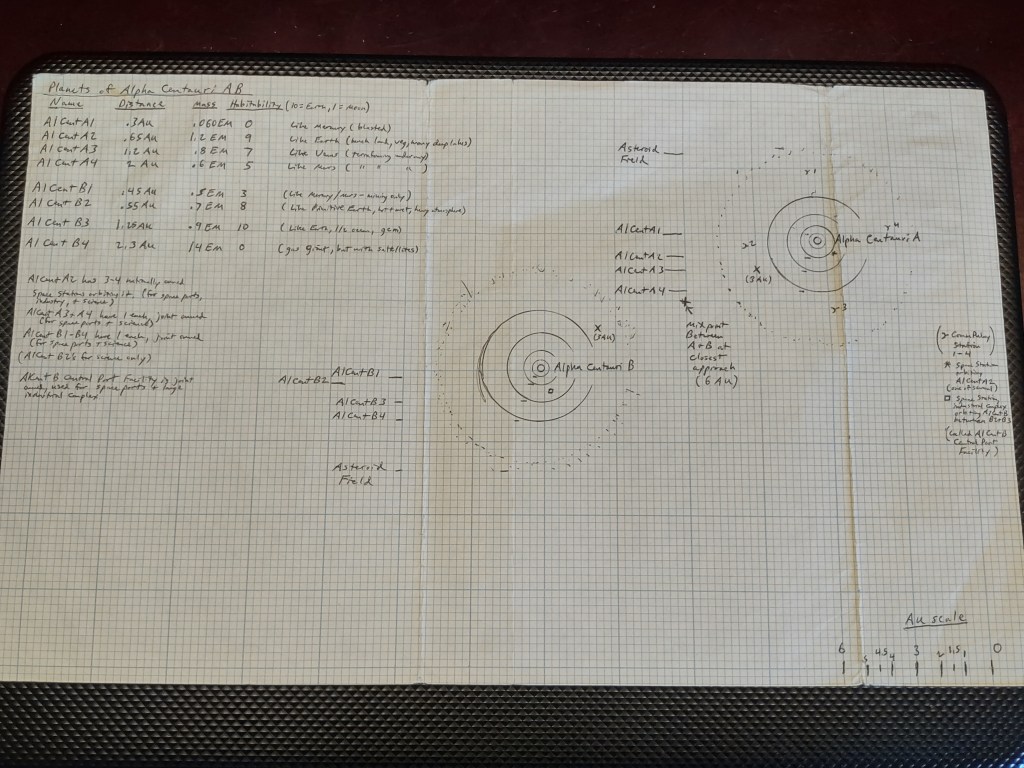As I fleshed out the story, I also fleshed out the design of the space station, which would be designated CR3 (Communications Relay Station 3). There are 4 in all, each orbiting at equidistant positions around the star Alpha Centauri A, or AlCent A in the dialect of the people in the story. (Chart explanation – AU is an astronomical unit. 1AU is the distance from the Earth to the Sun. EM is Earth Mass.)